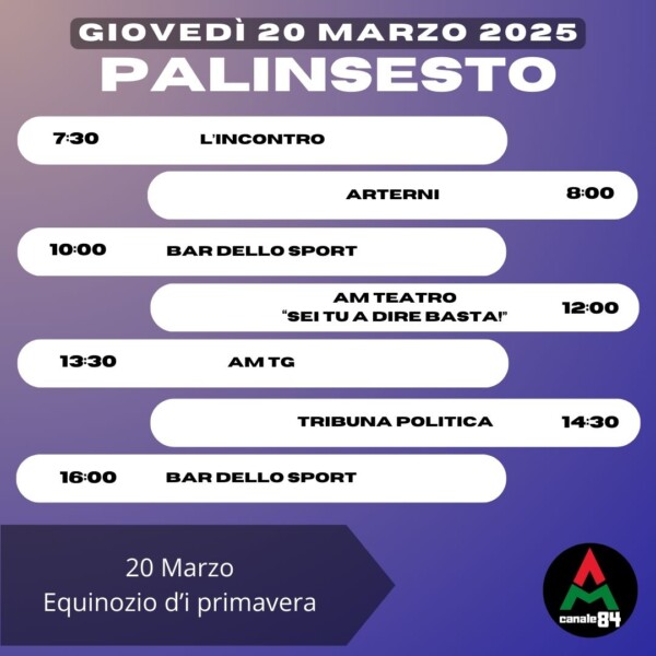 Palinsesto PALINSESTO – Giovedì 20 marzo 2025 Pubblicato 1 anno fa il 20/03/2025 da Redazione AM-TV Share Tweet This post has already been read 185 times! Correlati Related Topics: Up Next PALINSESTO – Venerdì 21 marzo 2025 Don't Miss PALINSESTO – Mercoledì 19 marzo 2025 Continue Reading You may like