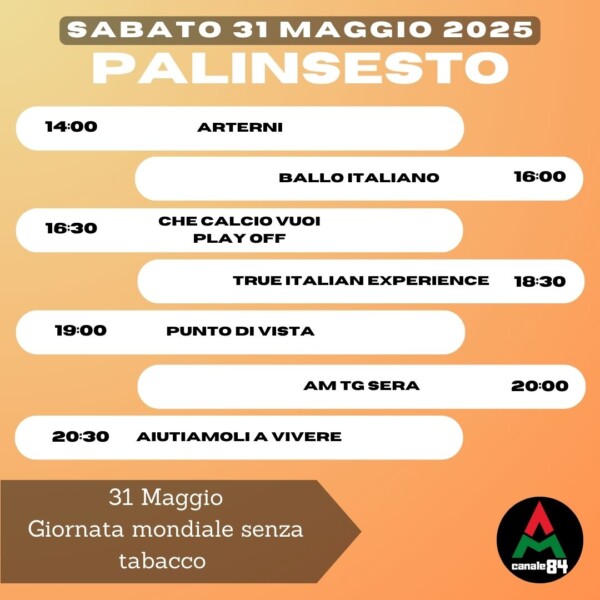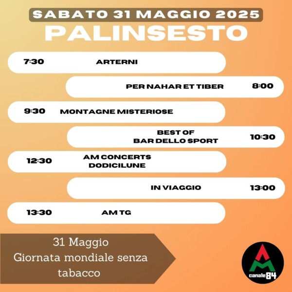 Palinsesto PALINSESTO – Sabato 31 maggio 2025 Pubblicato 11 mesi fa il 31/05/2025 da Redazione AM-TV Share Tweet This post has already been read 121 times! Correlati Related Topics: Up Next PALINSESTO – Domenica 01 giugno 2025 Don't Miss PALINSESTO – Venerdì 30 maggio 2025 Continue Reading You may like